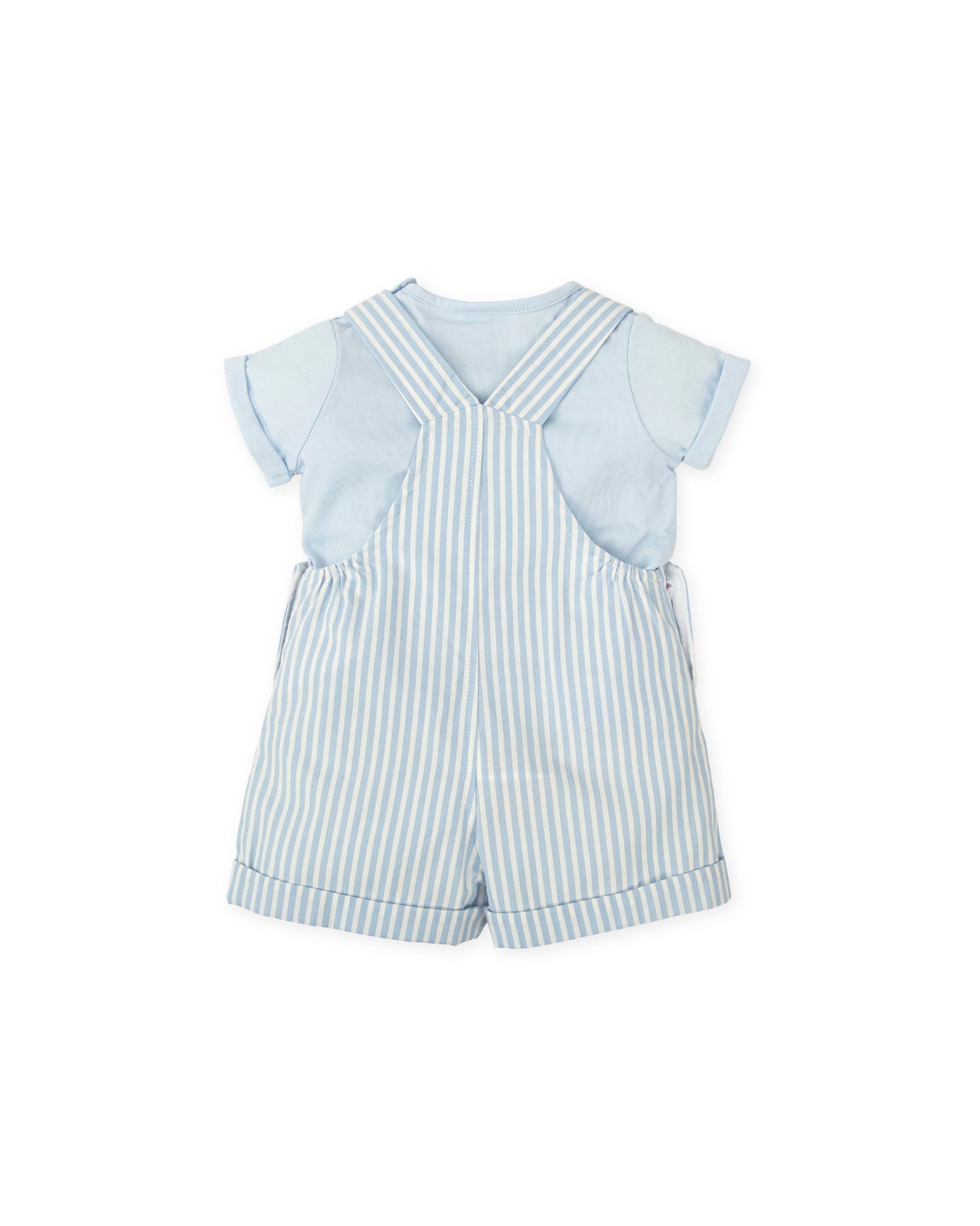 Conjunto de dos piezas de manga corta. Camiseta de punto liso celeste abierto en el hombro con botones a presión. Peto de popelín a rayas con abertura en tirantes y laterales con botones, abertura entrepierna con botones a presión hasta la talla 12 meses y decoración bolsillo con submarino.