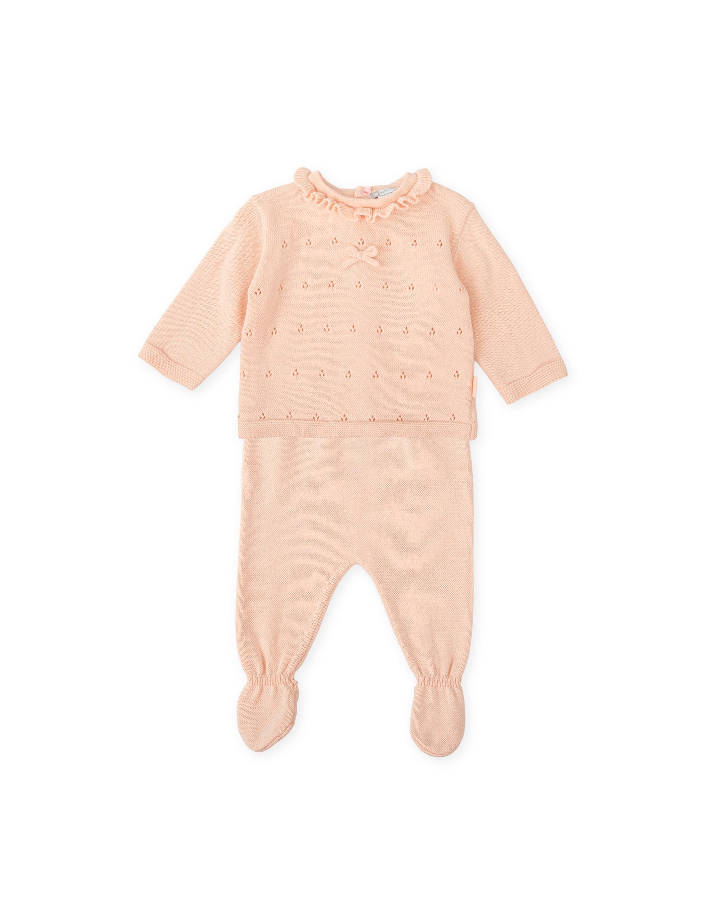 Conjunto de dos piezas con pie de tricot en color rosa. Jersey con detalle de volante alrededor del cuello y calado en la parte delantera. Polaina con elástico en cintura y tobillo para ajustar.