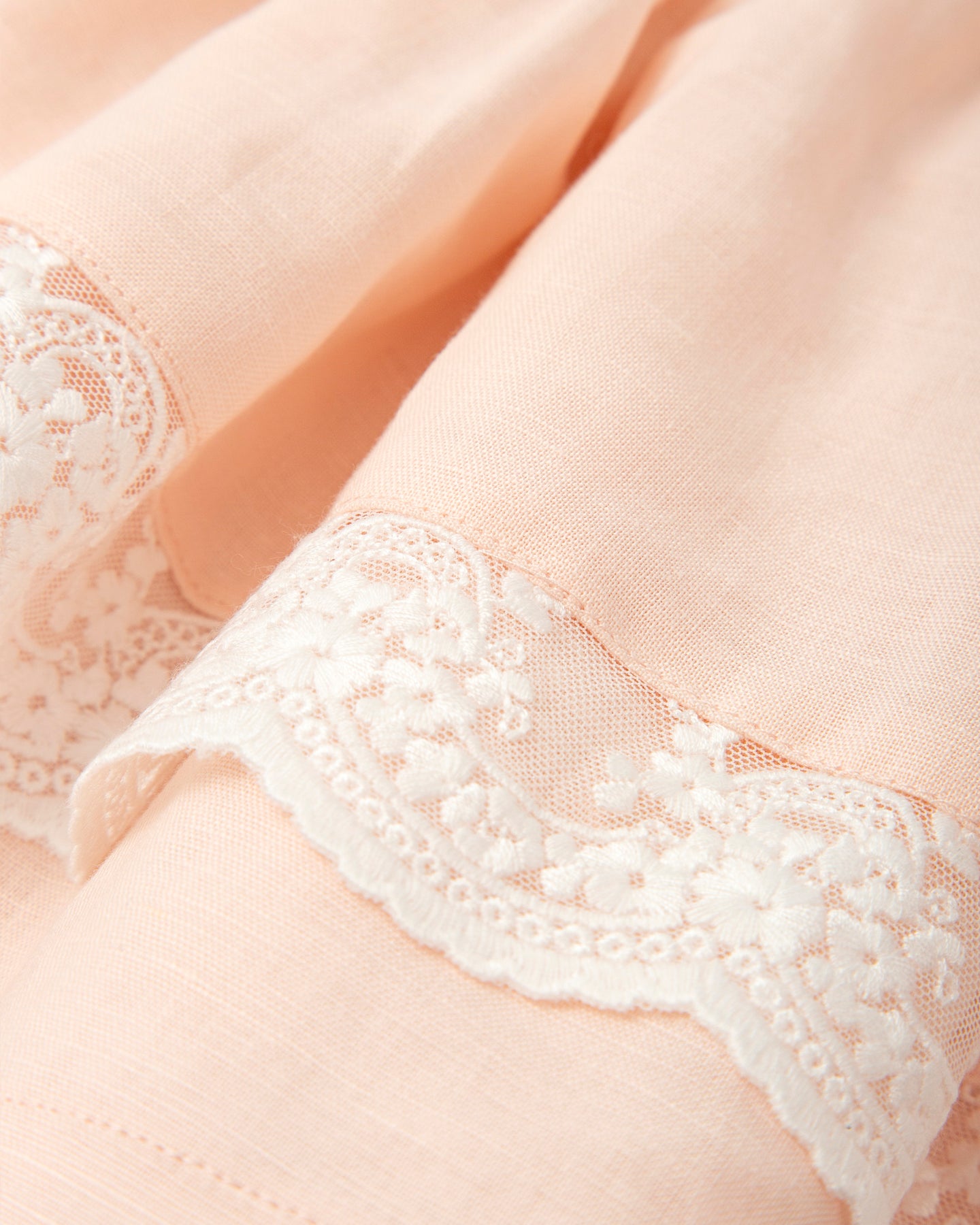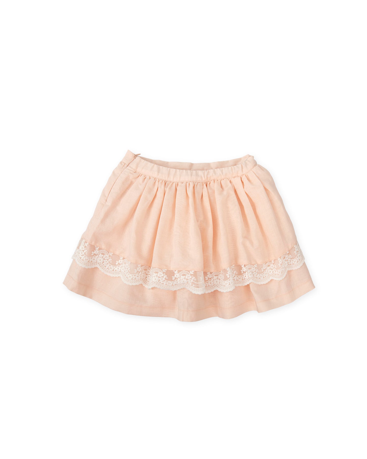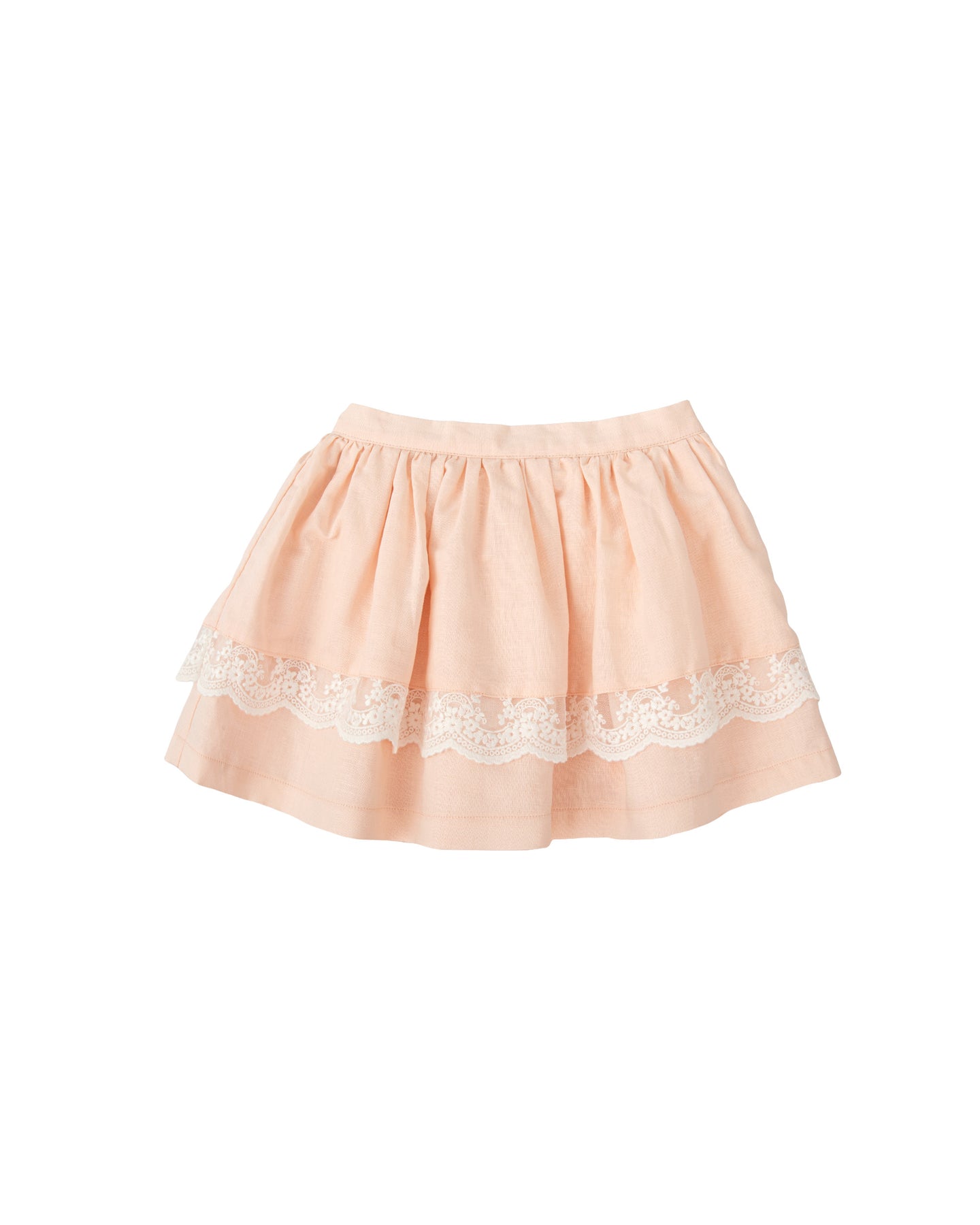 Falda de lino en color rosa con volantes y puntilla. Cintura ajustable en la parte trasera.