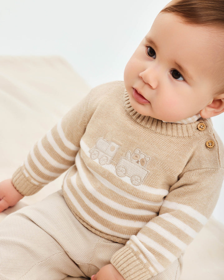 Jersey tricot en color arena con rayas en blanco roto. Detalle tren bordado. Abertura hombro con botones.