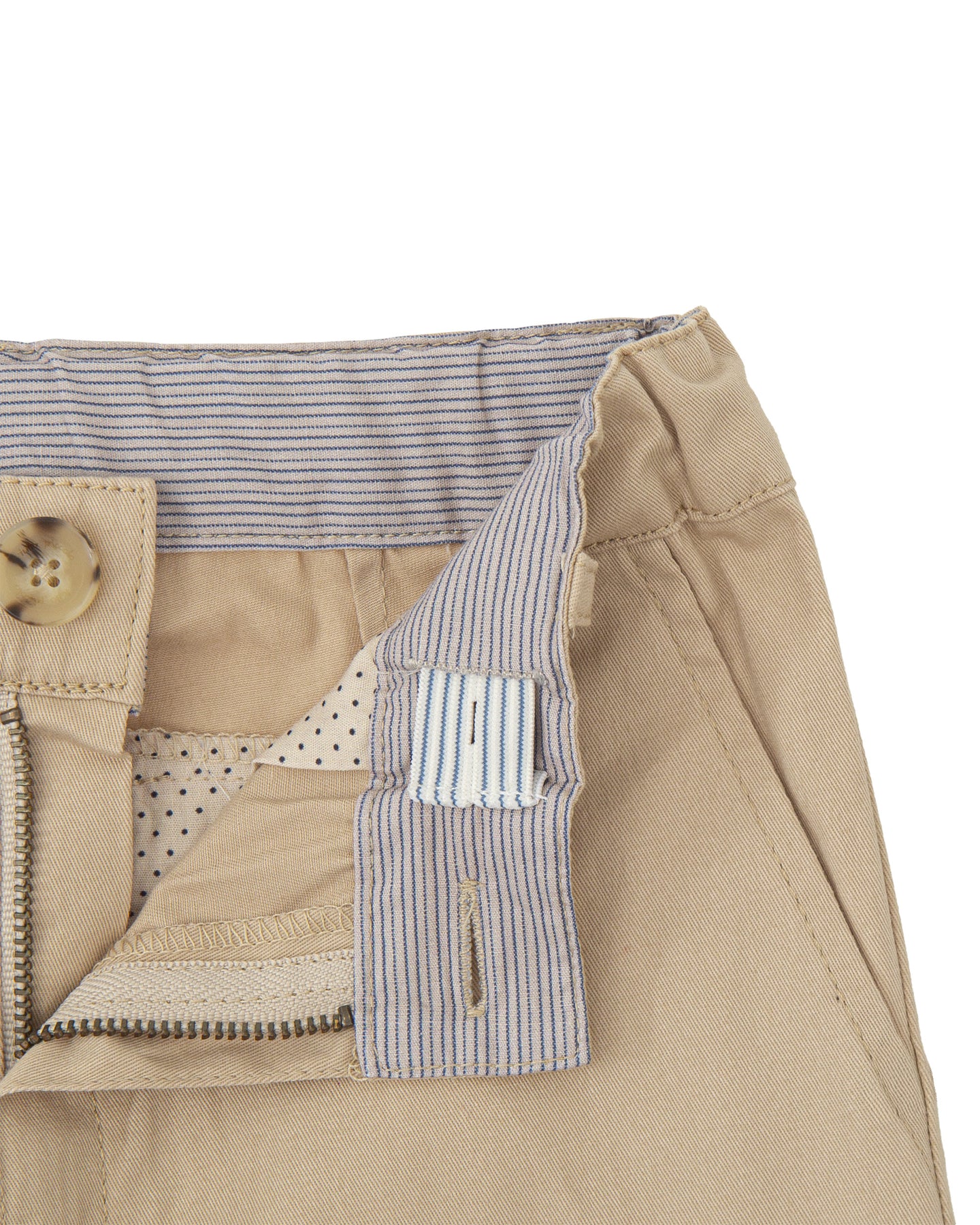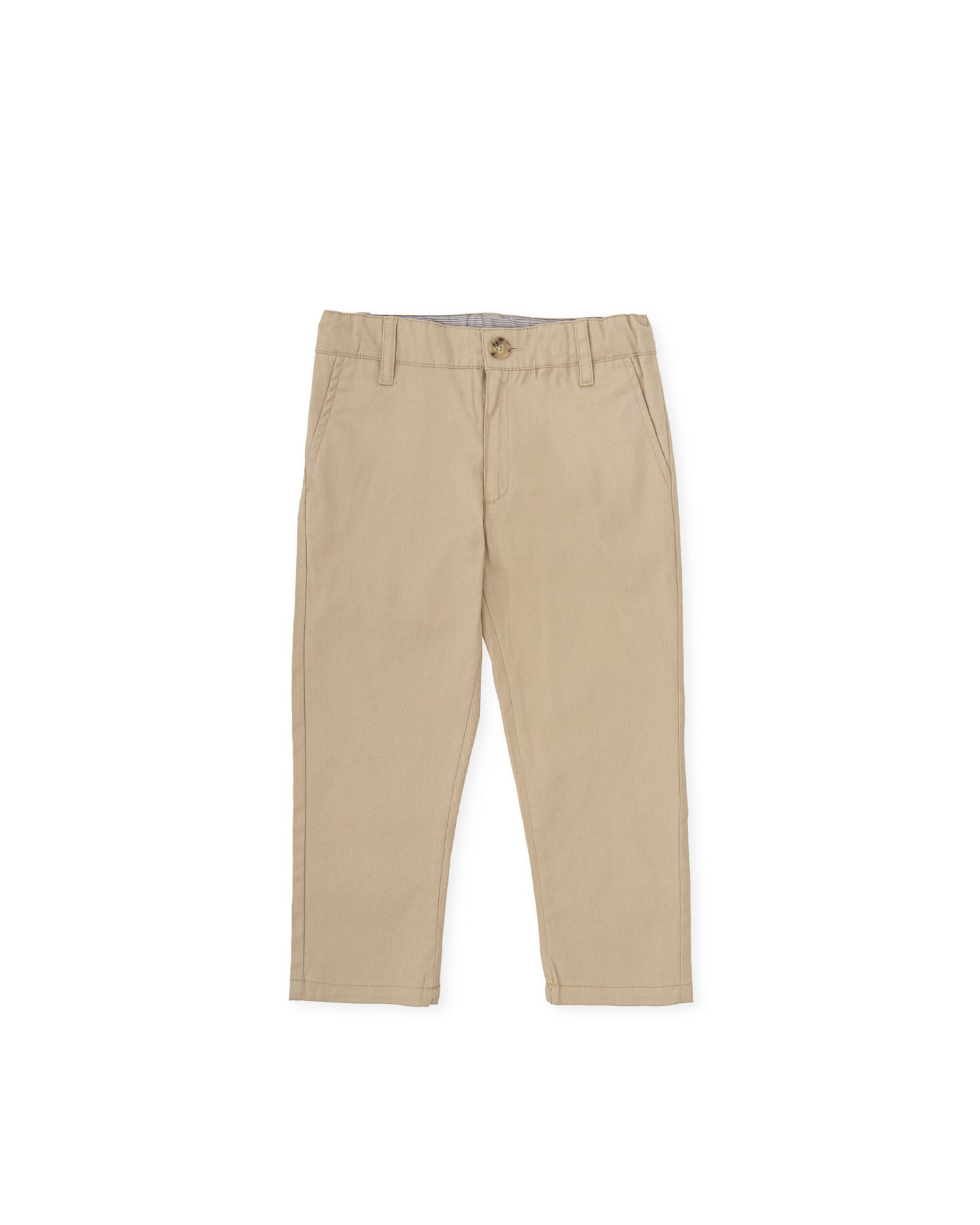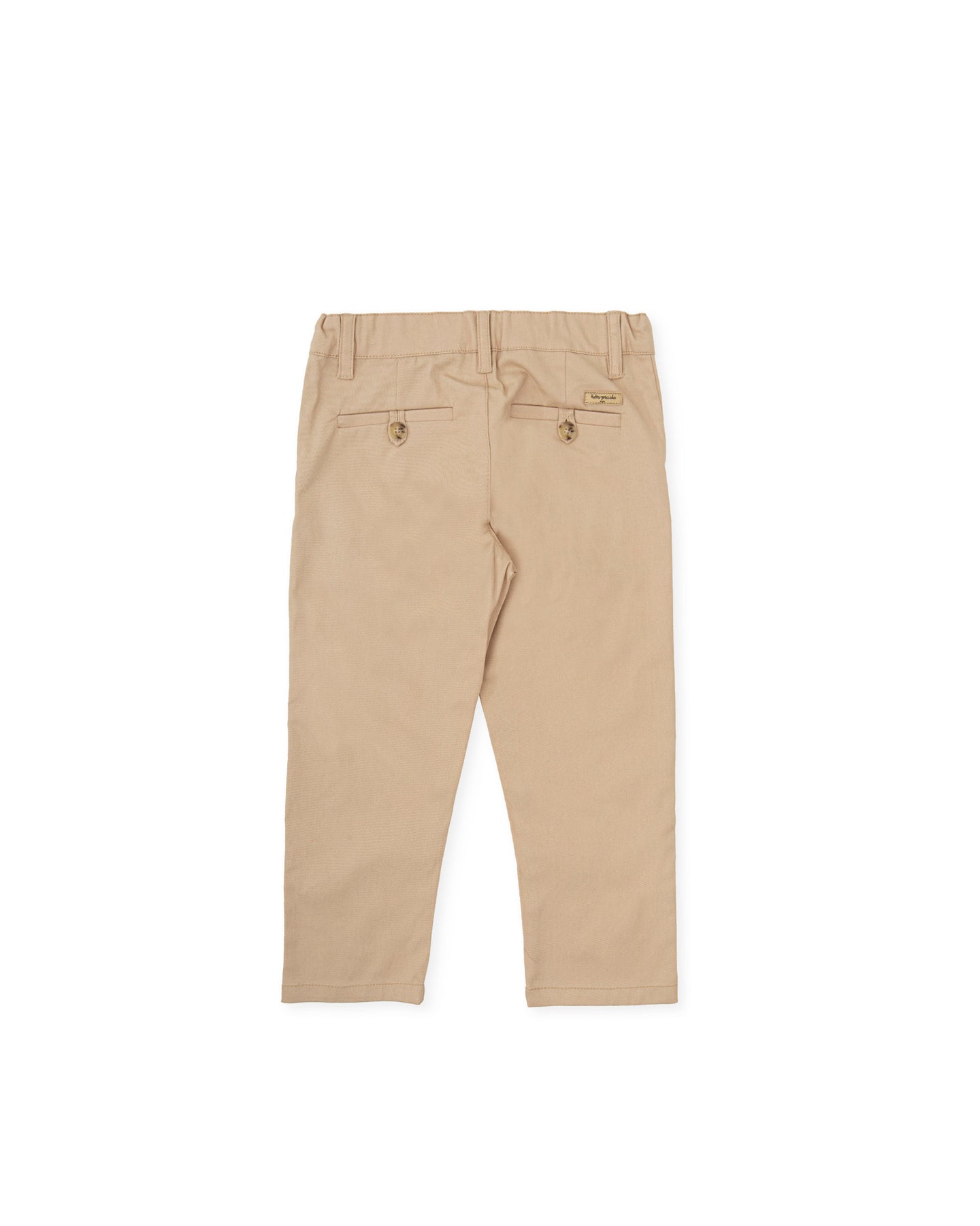Pantalón de tejido gabardina. Bolsillos traseros con botón y cintura ajustable. Dos versiones de color: arena y azul marino.