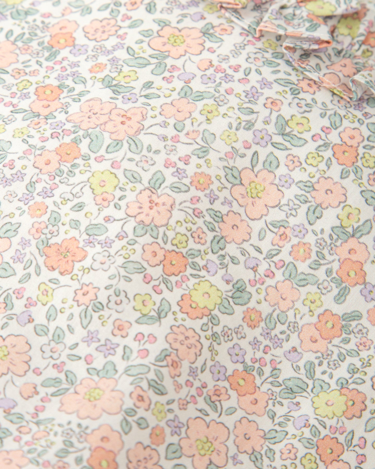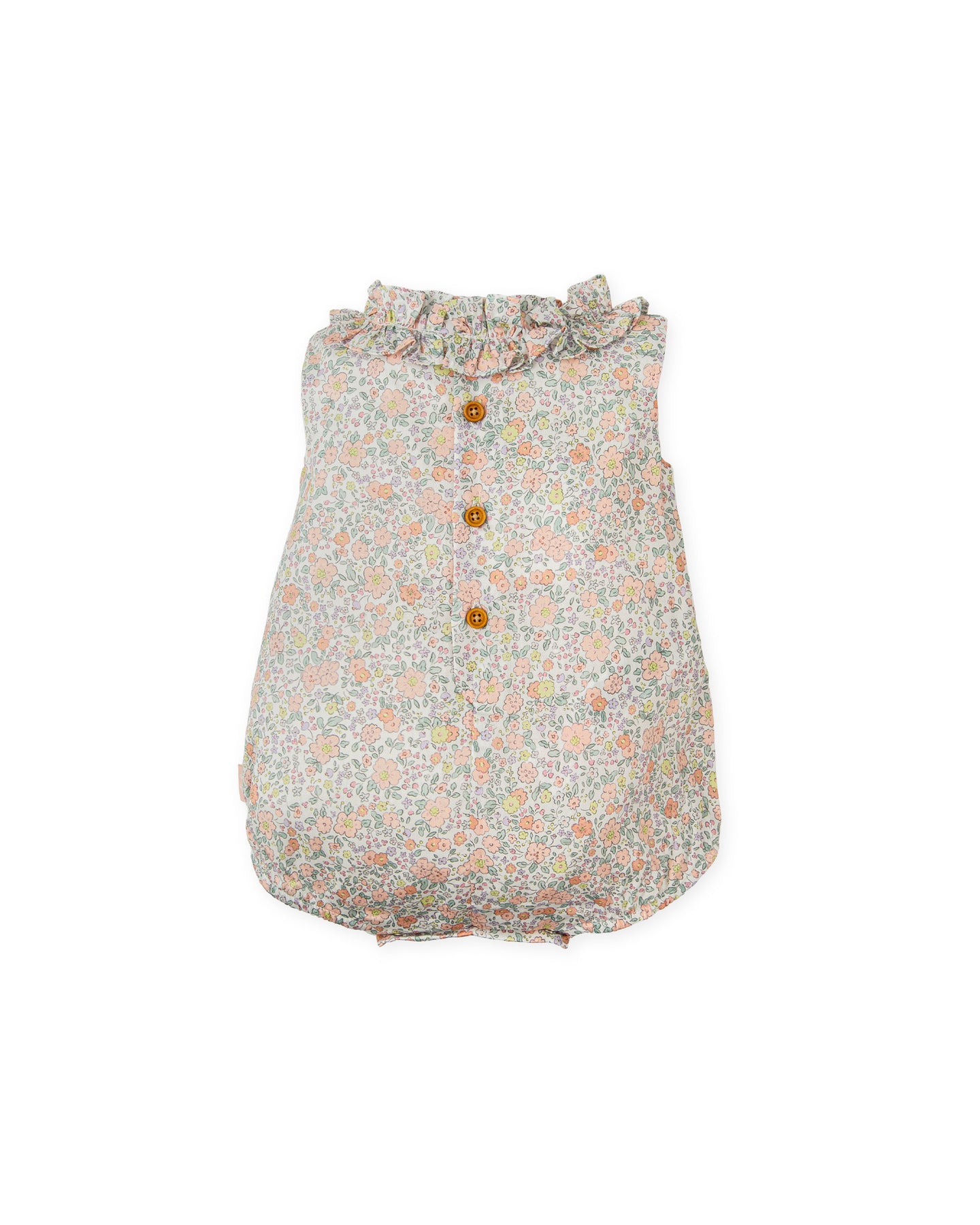 Pelele corto sin mangas de satén estampado flores con volante alrededor del escote. Abertura trasera con botones y en entrepierna con botones a presión.