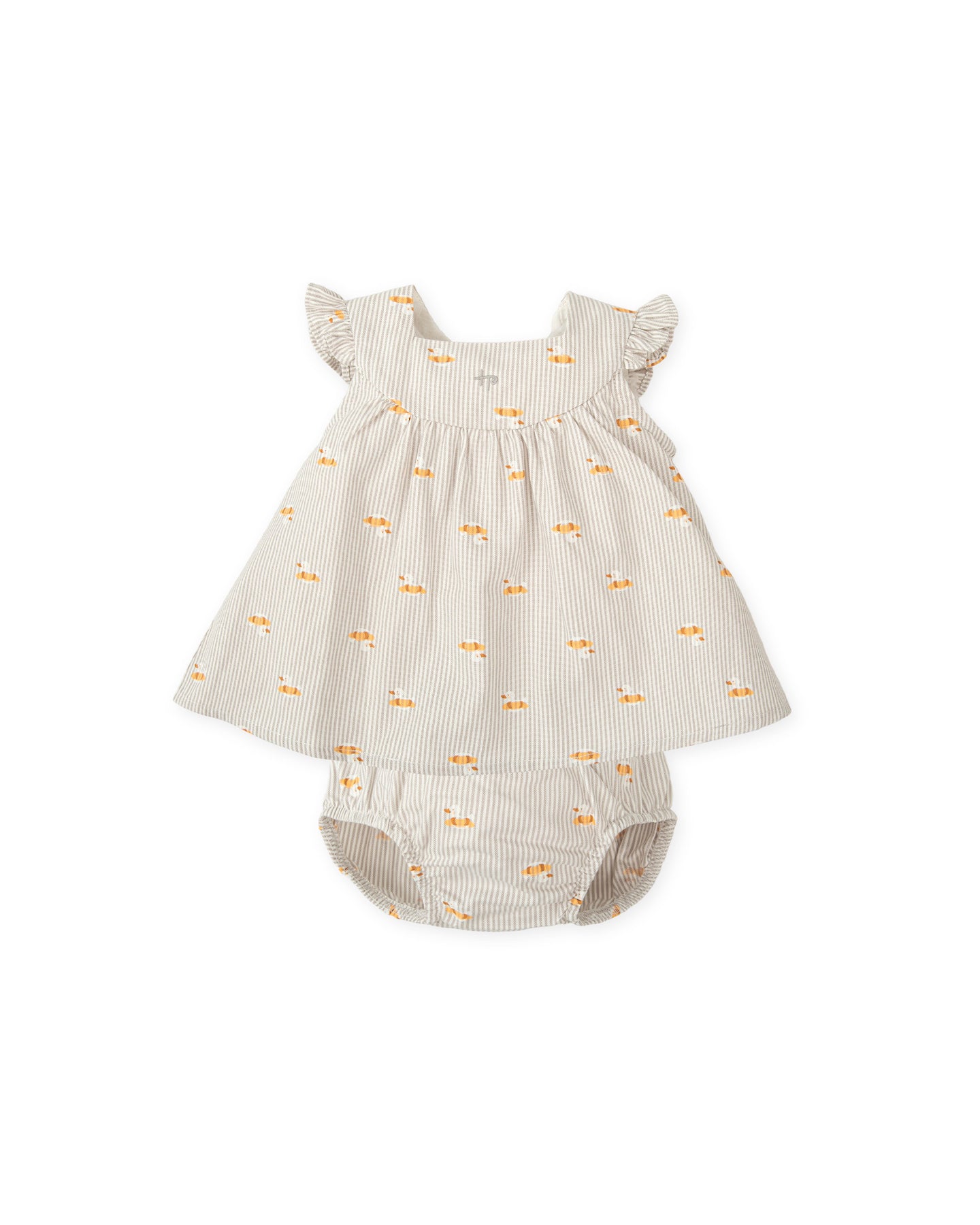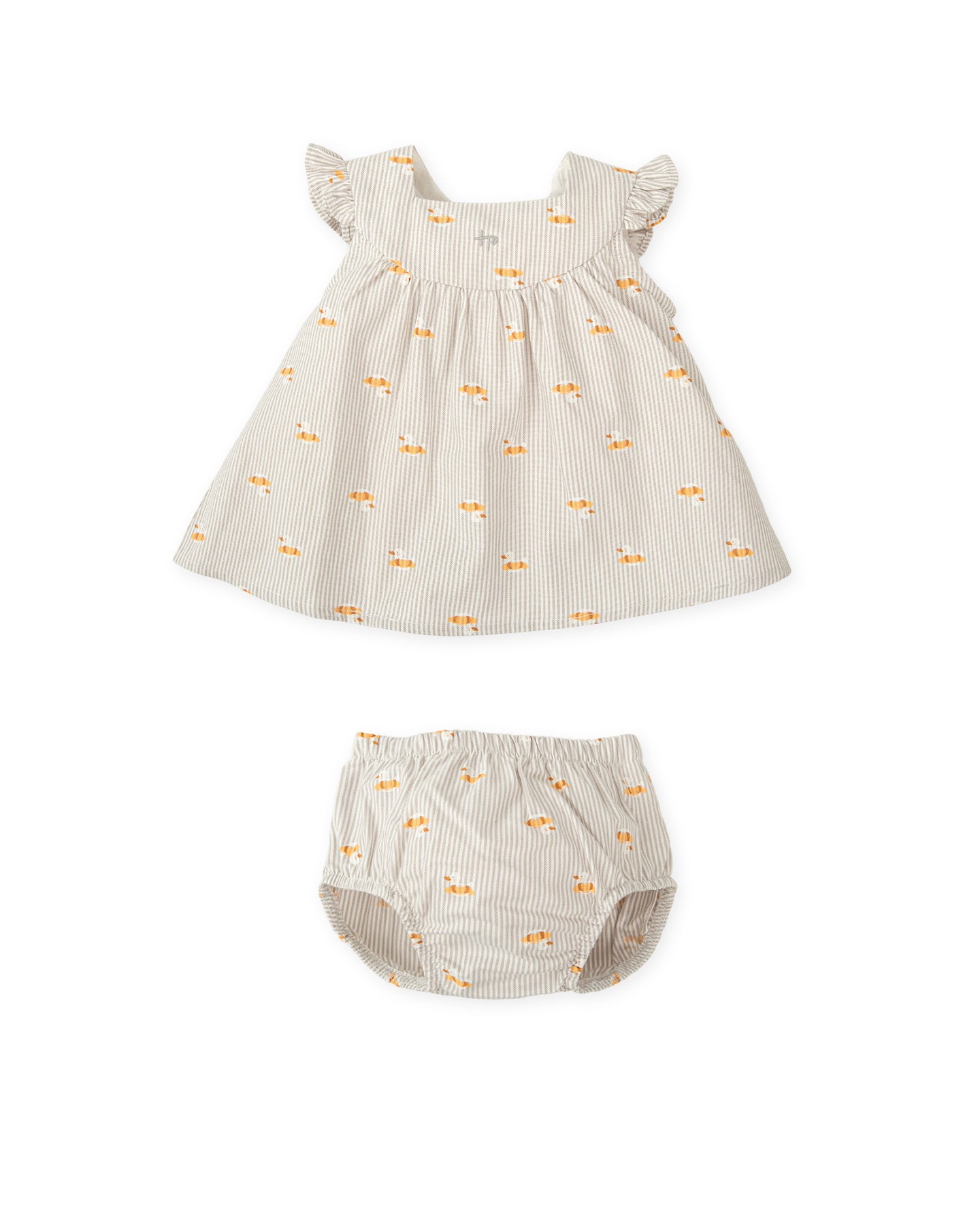 Vestido con braguita de popelín estampado rayas y patos con volantes en las mangas y abertura trasera con botones. Canesú forrado de suave voile blanco. Braguita con elástico en cintura y muslos.