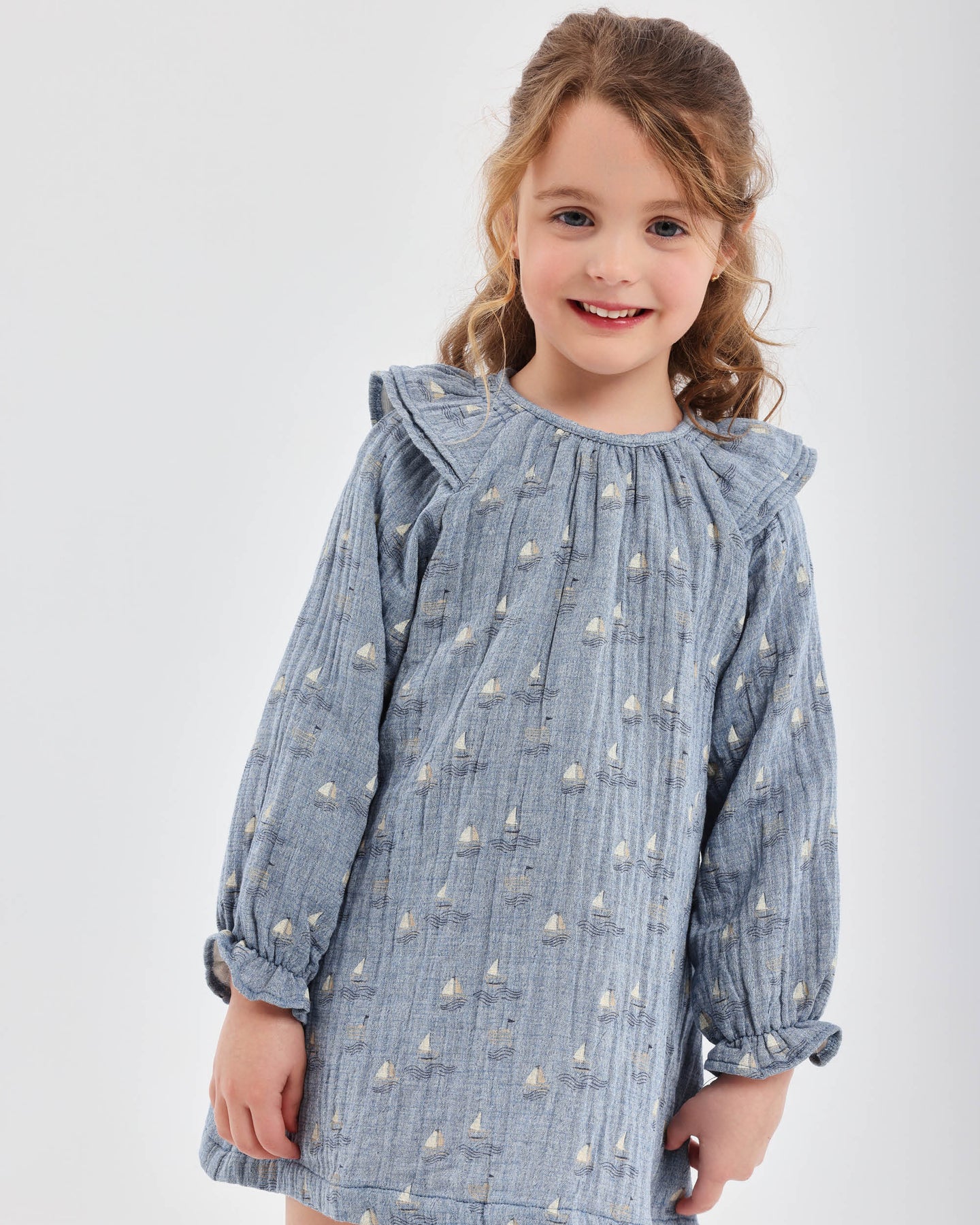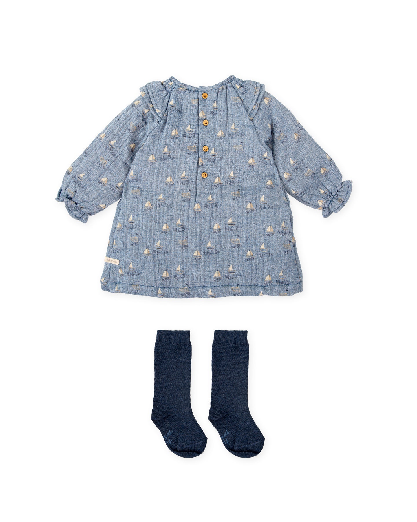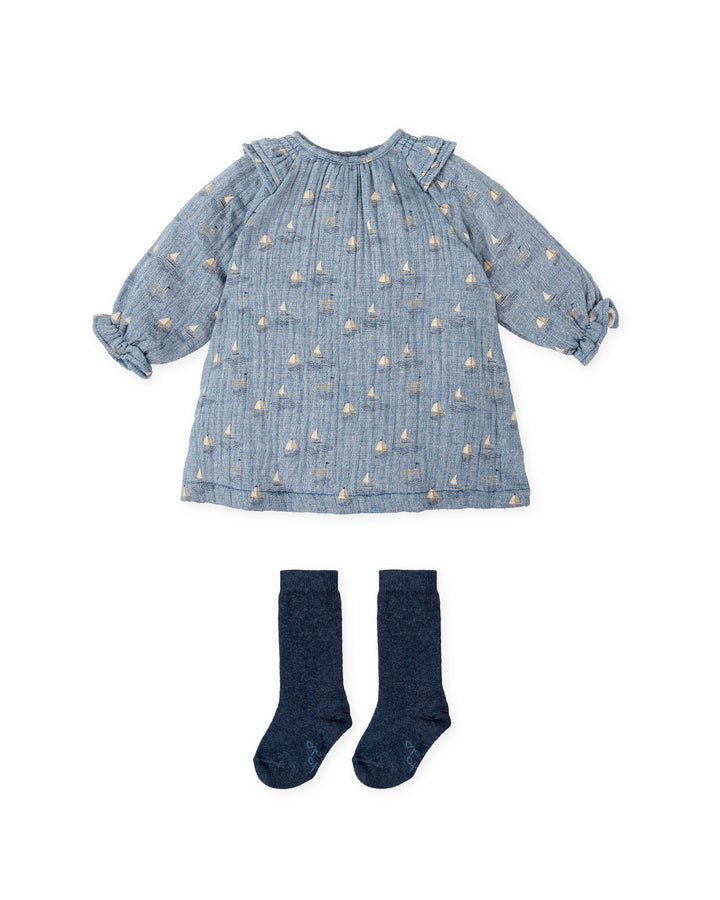 Vestido de bambula estampada barcos en color porcelana. Abertura espalda con botones. Combina con calcetines en color azul oscuro.