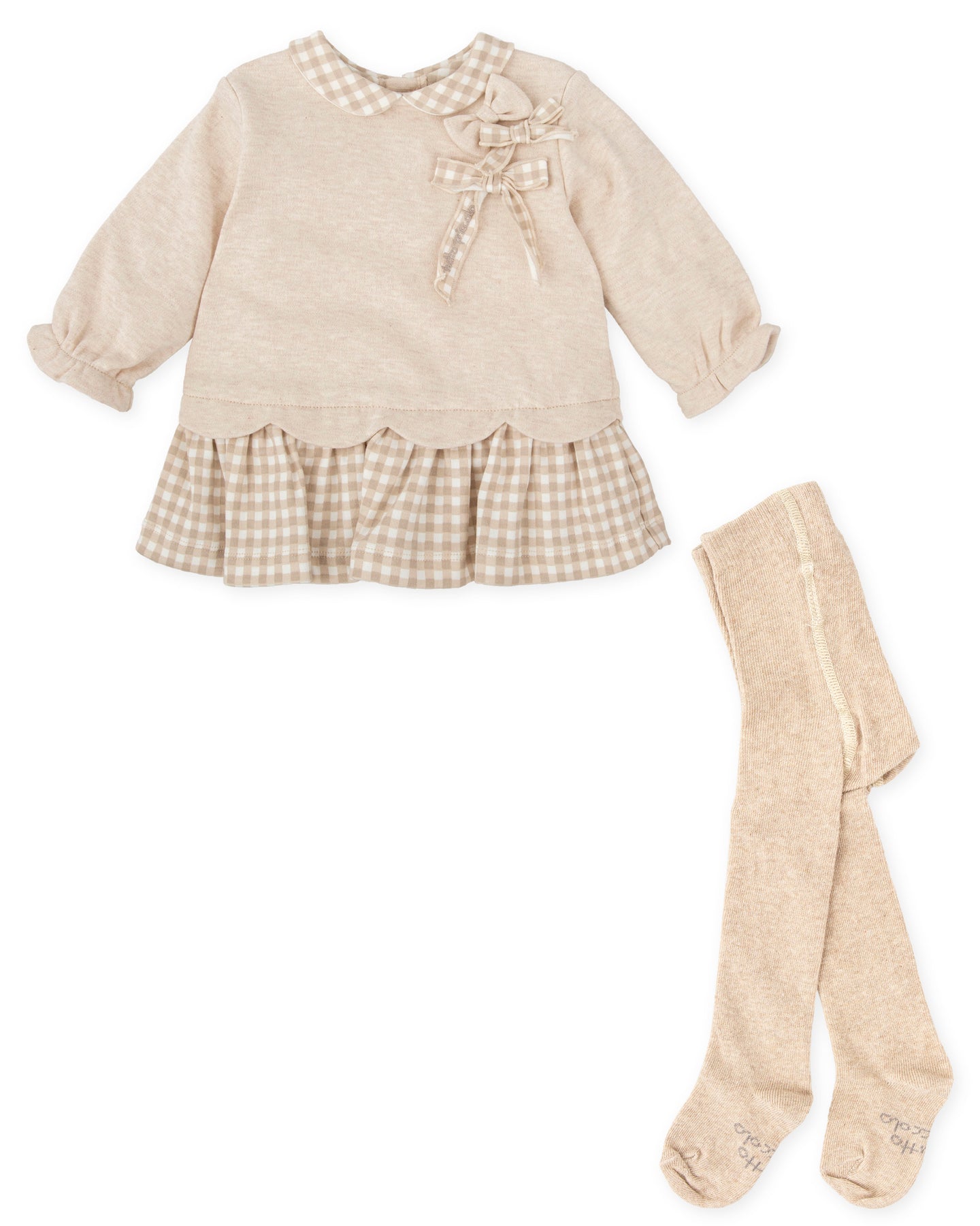 Vestido de interlock combinado liso color arena y cuadritos, detalle ondas, suave goma en los puños y abertura trasera con botones a presión. Combina con leotardos en color arena.