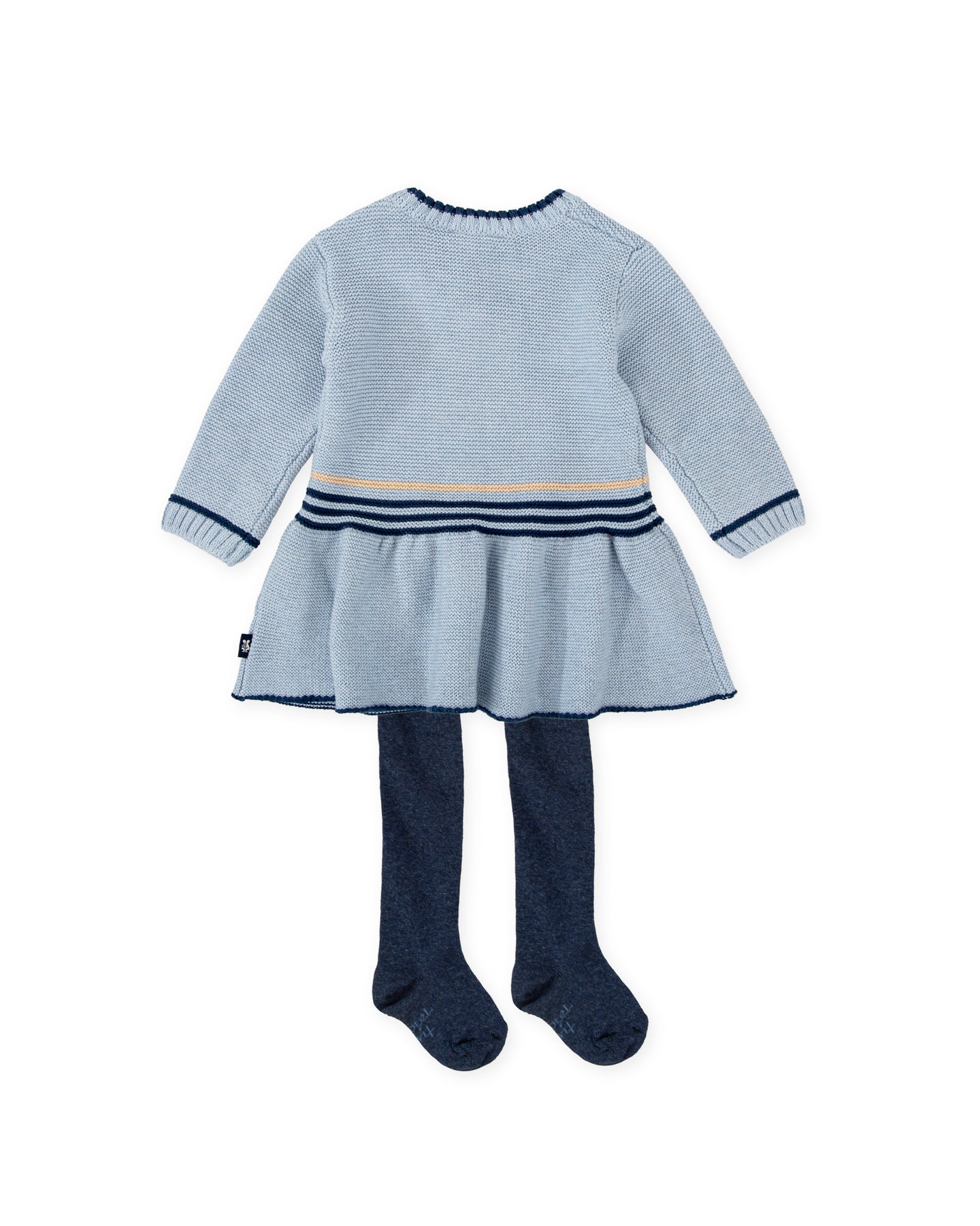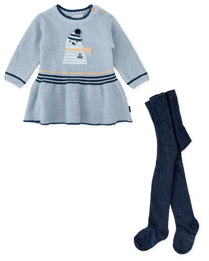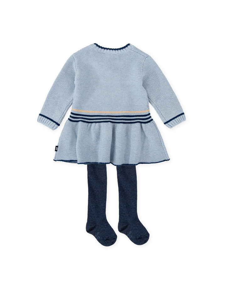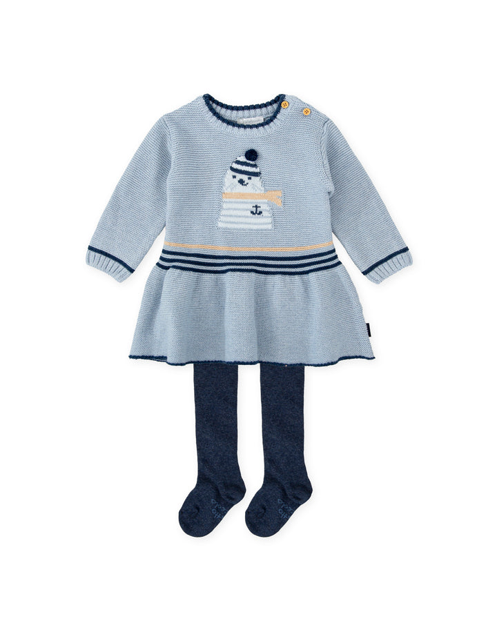 Vestido de tricot en color porcelana con decoración delantera. Abertura hombro con botones. Combina con leotardos en color azul oscuro.