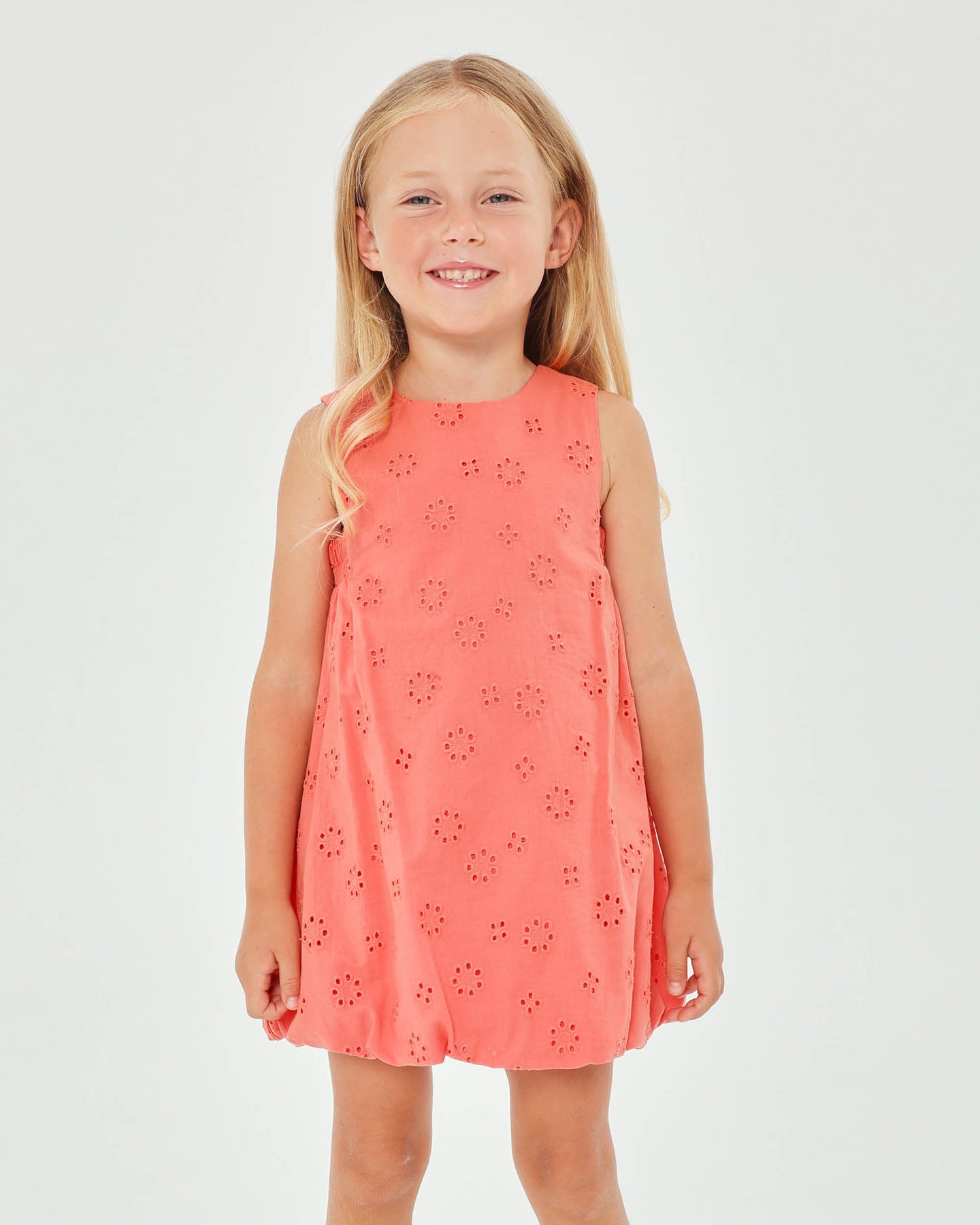 Vestido sin mangas efecto globo de tejido batista bordada en color coral. Elástico en laterales y trasero. Abertura trasera con cremallera.