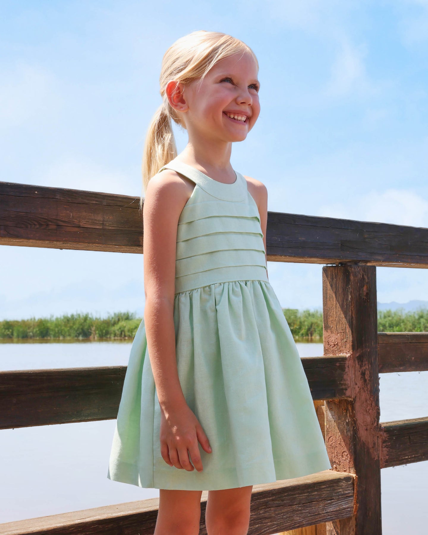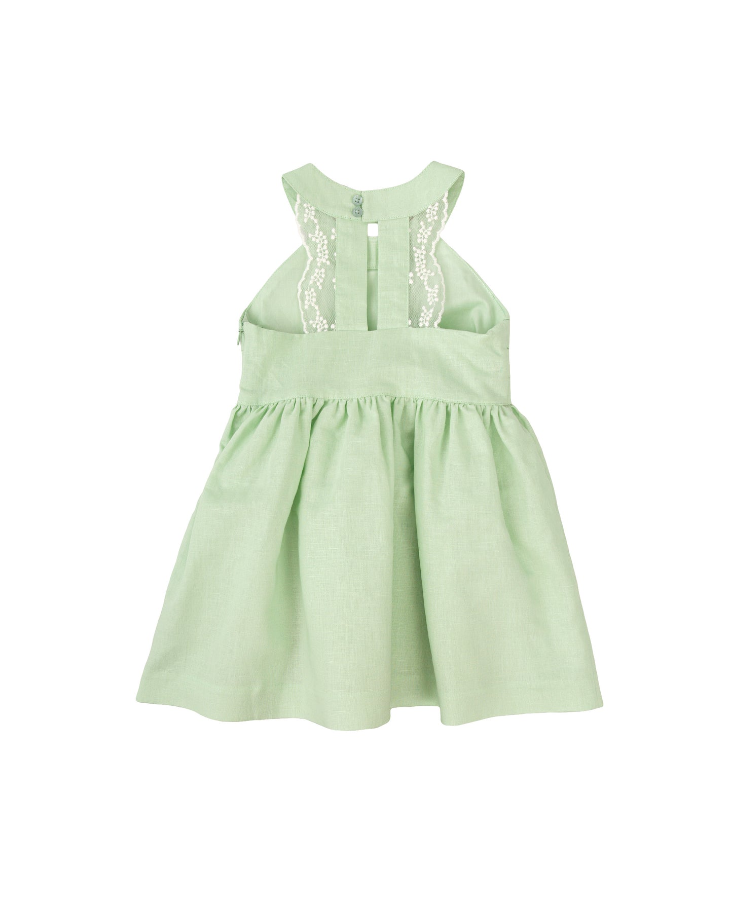 Vestido sin mangas de lino verde con pliegues en el delantero. Trasero con decoración de puntilla, cuello con dos botones y cremallera invisible en el lateral. Forrado de suave popelín al tono.